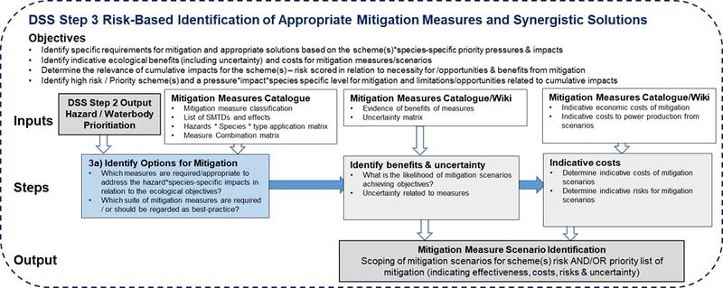 Conceptual flow diagram of Step 3 of the proposed Decision Support System Framework – Risk-Based identification of Appropriate Mitigation Measures and Synergistic Solutions. Grey = outputs/inputs to/from steps; blue = tasks; White = FIThydro inputs and matrices; Green = final output/objective. |