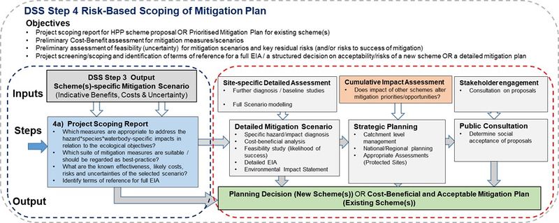 Conceptual flow diagram of Step 4 of the proposed Decision Support System Framework – Risk-Based Decision of Scheme Plan OR Prioritised Cost-Efficient Mitigation Plan. Grey = outputs/inputs to/from steps; blue = tasks; White = FIThydro inputs and matrices; Green = final output/objective. |