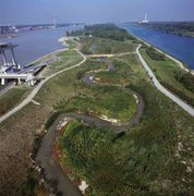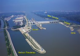 The Hydropower Plant at Freudenau is a multi-purpose hydro-power scheme located in the southern region of the Vienna metropolitan area. Six Kaplan bulb turbines are installed in the power house which is located in the middle of the river between the lock and weir systems. With a runner diameter of 7.5 m the turbines rank among the biggest in Europe. Ecological measures include the water supply to the New and Old Danube, new biotopes, and an ecologically designed bypass stream as a fishway on the Danube island.