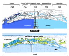 The average difference in water level between the individual pools amounts to 11 cm. The rough, asymmetric shape of the sills made from rough blocks increases the flow diversity and therewith the connectivity. The pools are characterized by flow rates of less than 1 m/s and scours of up to 1.5 m deep. As a result of the very slow flow velocity, fine sediment is increasingly covering the original sand-gravel mixture as integrated bottom substrate. The residual flow of the pool pass amounts to 900 l/s. The pool pass can receive additional residual water by means of an electronically controlled spillway gate or via an emergency pump. The bypass stream is fed via the outflow from the pool stream and via two flood gates depending upon the season and water flowing from the Danube. The rewith with dynamic total residual flow fluctuates between 1,500 l/s and 3,600 l/s.