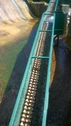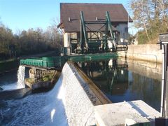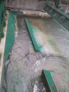 At the powerplant, the fishes can use a baffle fishpass composed of 5 portions of 7.5 m with a 16% slope. The portions are connected by pools (3.0x2.0x1.0m). The flow in the fishpass is 150 l/s. There is a specific device for eels: it is composed of 4 portions, each 4 to 6 m long, with a 25 to 30 % slope. These are connected by resting pools (1.5x1.0x0.5m). The flow allocated to the fish pass is only a few liters per second. These devices target the fish using the tailrace channel to go upstream.