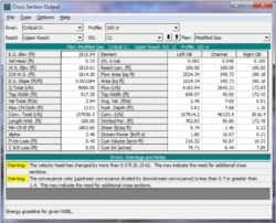 Outputs of HEC-RAS include graphics, like X-Y plots of the river system schematic, cross-sections (Figure 2), profiles (Figure 3), rating curves (Figure 4), hydrographs (Figure 5), and inundation mapping (Figure 6). Inundation maps can contain multiple background layers, like terrain and aerial photography, and additional geospatial data can be generated for the analysis of velocity, shear stress, stream power, ice thickness and floodway encroachment data. Tabular output (Figure 7) is available with the possibility of selecting pre-defined tables or developing customized tables. The graphical and tabular output can be exported to other software, such as a word-processor or a spreadsheet.