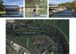 At Schiffmühle, hydropower is exploited in two run-of-river HPPs, namely the main powerhouse located at the end of a headrace channel on the right shore and the residual flow HPP situated next to a flap gate at the upstream end of the weir on the left shore (see Gallery, layout of HPP Schiffmühle). In the scope of FIThydro, the residual flow HPP is the investigated case study HPP. This HPP has an installed capacity of 0.5 MW and a mean annual output of 1.9 GWh. It operates with a bevel gear bulb turbine.
