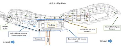 The studies at HPP Schiffmühle address various aspects of the upstream and downstream fish passes, downstream habitat and sediment transport. The findings of the studies have a wide range of applications for other HPPs and give answers to the fundamental questions on fish behavior at fish passes.