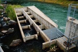 The residual flow HPP Schiffmühle has a combination of a nature-like and a technical fish pass (vertical slot) for upstream migration. The entrances of the nature-like fish pass and the vertical slot pass are located approx. 36 m and 2 m downstream of the turbine flow outlet, respectively. The technical and the nature-like fish passes merge at an elevation of 336.83 m a.s.l. (see figures in the Gallery). From there on upwards, fish use the nature-like pass. The total discharge in the fishway is 0.5 m3/s.