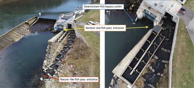 The flow conditions at the entrance of the nature-like fishway of the residual flow HPP Schiffmühle is more attractive for all monitored fish species than the flow condition at the entrance of the vertical slot fishway close to the draft tube outlet. However, the fish entrance efficiency is higher for the vertical slot fishway. Overall, the passage efficiency of the fish pass system is high (> 80 % for most species monitored), indicating an appropriate design and a good functionality.