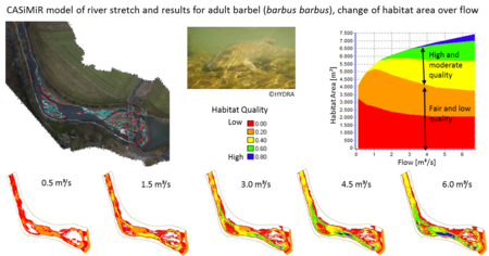 Figure 1: CASiMiR model of river stretch and results for adult barbel.