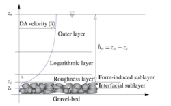 The flow is subdivided into three main layers according to the influence of occurring stresses: The top layer is called the outer layer, where bed roughness does not influence the velocity distribution. The next layer closer to the river bed is the logarithmic layer, where the distribution of the time-averaged velocity follows a logarithmic law. The logarithmic region does not reach until the roughness tops. The roughness layer is the first defined flow region to contain free flowing parts as well as the upper part of the roughness elements. In contrast to the other flow regions the roughness layer is influenced by the individual roughness elements of the river bed and therefore faces additional forces. It is subdivided into the form-induced sublayer just above the roughness crests and the interfacial sublayer which occupies the flow region between the troughs and the tops of the roughness elements. The form-induced sublayer was introduced because the flow is strongly affected by turbulences produced by the roughness crests which may appear as small eddies and causes an extensive spatial heterogeneity.