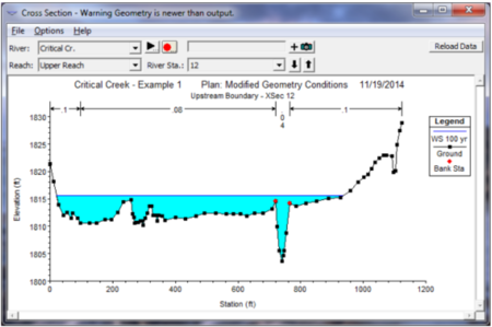 Outputs of HEC-RAS include graphics, like X-Y plots of the river system schematic, cross-sections (Figure 2), profiles (Figure 3), rating curves (Figure 4), hydrographs (Figure 5), and inundation mapping (Figure 6). Inundation maps can contain multiple background layers, like terrain and aerial photography, and additional geospatial data can be generated for the analysis of velocity, shear stress, stream power, ice thickness and floodway encroachment data. Tabular output (Figure 7) is available with the possibility of selecting pre-defined tables or developing customized tables. The graphical and tabular output can be exported to other software, such as a word-processor or a spreadsheet.