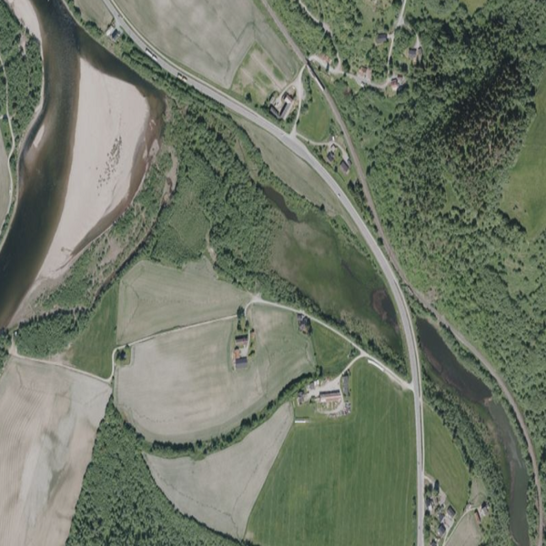 The main river Gaula in central Norway flowing to the left in the photo, with parts of the old braiding river de-connected from the free-flowing section, e.g. to right of the highway, and spots here and there in the landscape closer to the main river