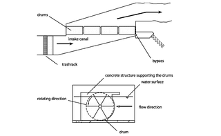 Revision as of 14:14, 5 April 2020 by Bendikhansen (talk | contribs) ({{Information |author= |source=EPRI. 1994. Research update on fish protection technologies for water intakes. Boston, Massachussetts : Stone and Webster Eng. Corp., 1994. p. 225. |description=Schematic of angled rotary screen layout. }})
