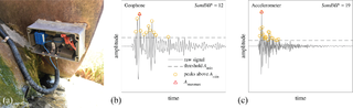 (a) Geophone and accelerometer installed in a watertight housing mounted on an impact plate and exemplary (b) geophone and (c) accelerometer signal of the identical single grain impact |