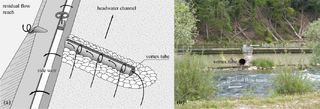 (a) Conceptual sketch of the vortex tube functionality and (b) vortex tube outlet at HPP Schiffmühle |