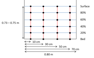 Flow cross-section with the verticals (in red) and the points (black dots) for velocity measurement with the current meter |