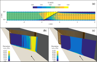 Example of ParaView visualization of OpenFOAM simulation results showing horizontal flow velocities in a rectangular channel with a curved bar rack (CBR) for horizontal plane at 0.2 m (a). Deviation (in percent) of the ratio between tangential vt and normal velocities vn for the MCR compared to the situation without screen 5 cm (b) and 40 cm (c) upstream of the screen axis. The black arrows represent the flow direction