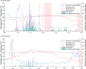 Fish attempts to pass and ascent success in Guma fishway, related to flow discharge and water temperature. Water head refers to the difference between water level upstream and downstream of the fishway. Between 30/10/2018 and 01/04/2019 data logger was running but there were no data in the antennas.
