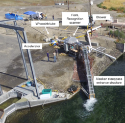 Temporary installation of a WFPS where Chinook salmon were separated from Steelhead. The entrance structure is an Alaskan steeppass which is very efficient for salmonids.