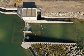 Aerial view of the two shafts with four trash-rack modules at Großweil, Bavaria. Germany.