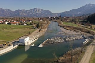 Aerial view of the 420kW HYDROSHAFT powerplant at the Loisach River in Großweil, Bavaria. Germany. |