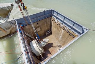 Revision as of 14:57, 9 October 2020 by Bendikhansen (talk | contribs) ({{Information |author= |source=TU Munich |description=Setting in place of the 420kW turbine. Instead of classical stop-logs a metal shield holds the shaft dry for mounting and revisions. }})