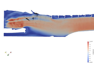 Velocity field of tailwater of HPP Freudenau with a fish track (black points) created using FLOW3D.