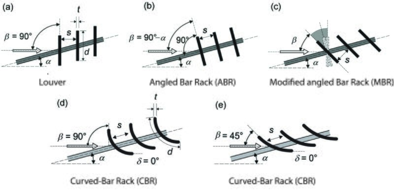 Different fish guidance structure layouts (a) Louver, (b) Angled Bar Rack (ABR), (c) Modified angled Bar Rack (MBR) and Curved-Bar Racks (CBRs) with upstream tip angle of (d) 90° and (e) 45° |