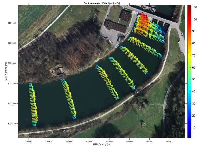 Revision as of 09:50, 23 October 2020 by Bendikhansen (talk | contribs) ({{Information |author=Stephan Kammerer |source=VAW of ETH Zurich (background image: © 2018 swisstopo (JD 100041)) |description=Exemplary depth-averaged velocity fields [cm/s] upstream of HPP Bannwil measured with boat-mounted ADCP at a discharge of 402 m3/s }})