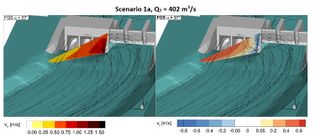 Revision as of 09:51, 23 October 2020 by Bendikhansen (talk | contribs) ({{Information |author=Stephan Kammerer |source=VAW of ETH Zurich |description=Exemplary variant study for HPP Bannwil using numerical modelling. Normal (left) and tangential (right) flow velocities at potential FGS positions upstream of the turbine inlets for scenario 1a for fish guidance structures angled at 37° (see FIThydro Deliverable 2.2 for detailed information) }})