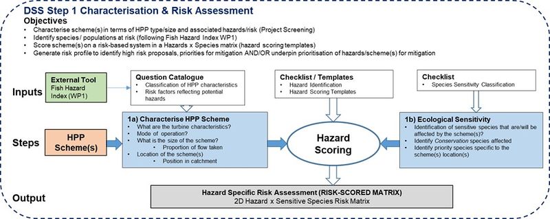 Conceptual flow diagram of Step 1 of the proposed Decision Support System Framework - Pre-screening characterisation and risk identification. Grey = outputs/inputs to/from steps; blue = tasks; White = FIThydro inputs and matrices; Green = final output/objective. |