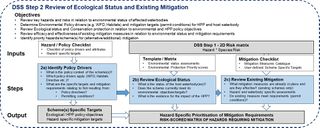 Conceptual flow diagram of Step 2 of the proposed Decision Support System Framework – Ecological Pressures and Impacts Characterisation and Risk Identification. Grey = outputs/inputs to/from steps; blue = tasks; White = FIThydro inputs and matrices; Green = final output/objective |