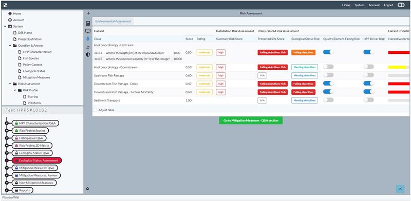 FIThydro DSS ecological status risk matrix identifying the calculated Protect Site Score, Ecological Status Risk Score and indicating whether priority quality elements (fish, hydromorphology, continuity) are identified as a reason for failing the objectives and whether the HPP has been identified in river basin management plans to be significantly contributing to a failure to achieve good ecological status. These components are combined into the Hazard/waterbody priority score metric. |