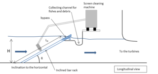 Revision as of 14:55, 19 November 2020 by Bendikhansen (talk | contribs) ({{Information |author=Dominique Courret |source=Courret, D., Larinier M. (2008). Guide pour la conception de prises d’eau “ichtyo-compatibles” pour les petites centrales hydroélectriques [Guide for the design of fish-friendly intakes for small hydropower plants]. France: Agence de l’Environnement et de la Maîtrise de l’Energie (ADEME). Report No: RAPPORT GHAAPPE RA.08.04. http://www.onema.fr/IMG/pdf/2008_027.pdf (in French). |description=Longitudinal view of an inclined bar rack }})