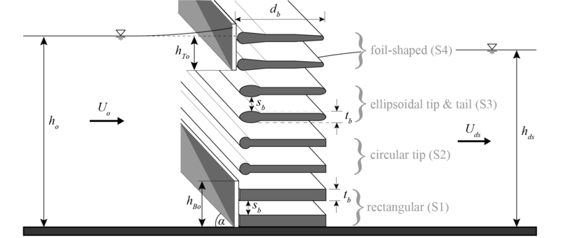 Revision as of 15:05, 19 November 2020 by Bendikhansen (talk | contribs) ({{Information |author=Julian Master |source=Meister, J.; Fuchs, H.; Beck, C.; Albayrak, I.; Boes, R.M. (2020a). Head Losses of Horizontal Bar Racks as Fish Guidance Structures. Water, 12(2): 475. http://dx.doi.org/10.3390/w12020475. |description=Side view of an HBR illustrating different rack parameters; ho: approach flow depth, hds: downstream flow depth, Uo: mean upstream approach flow velocity from continuity, Uds: mean downstream flow velocity, hBo: bottom overlay height, hTo: top overlay...)